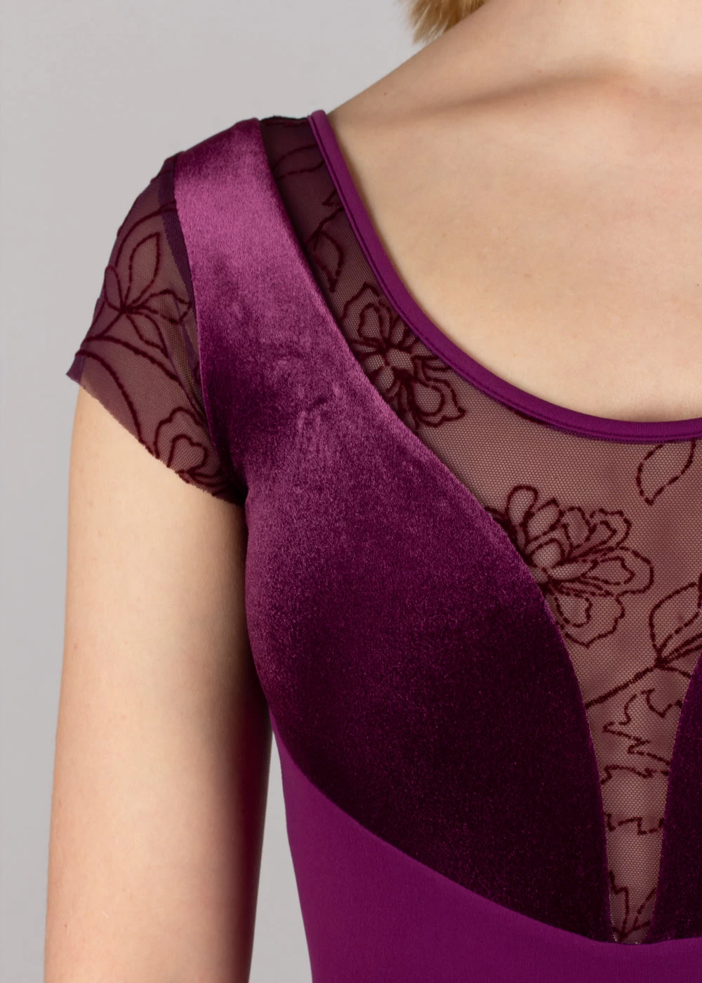 Mesh cap sleeve leotard with classic illusion bust detail and plunge neckline. Low back with mesh. Italian flocked mesh is comfortable and fashionable. Slight V lower back.