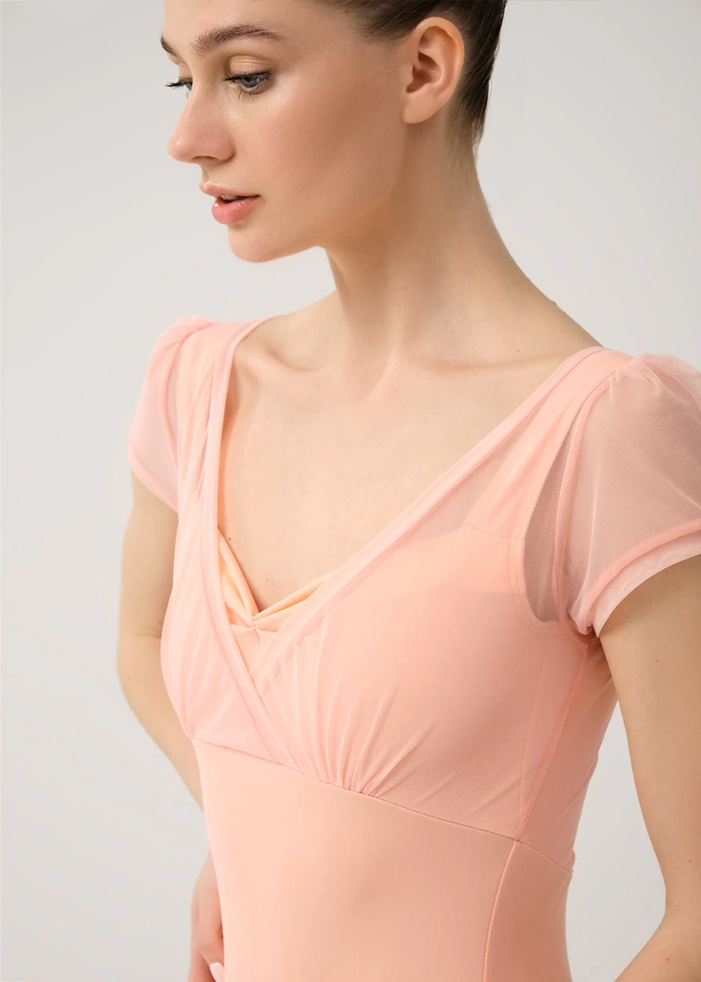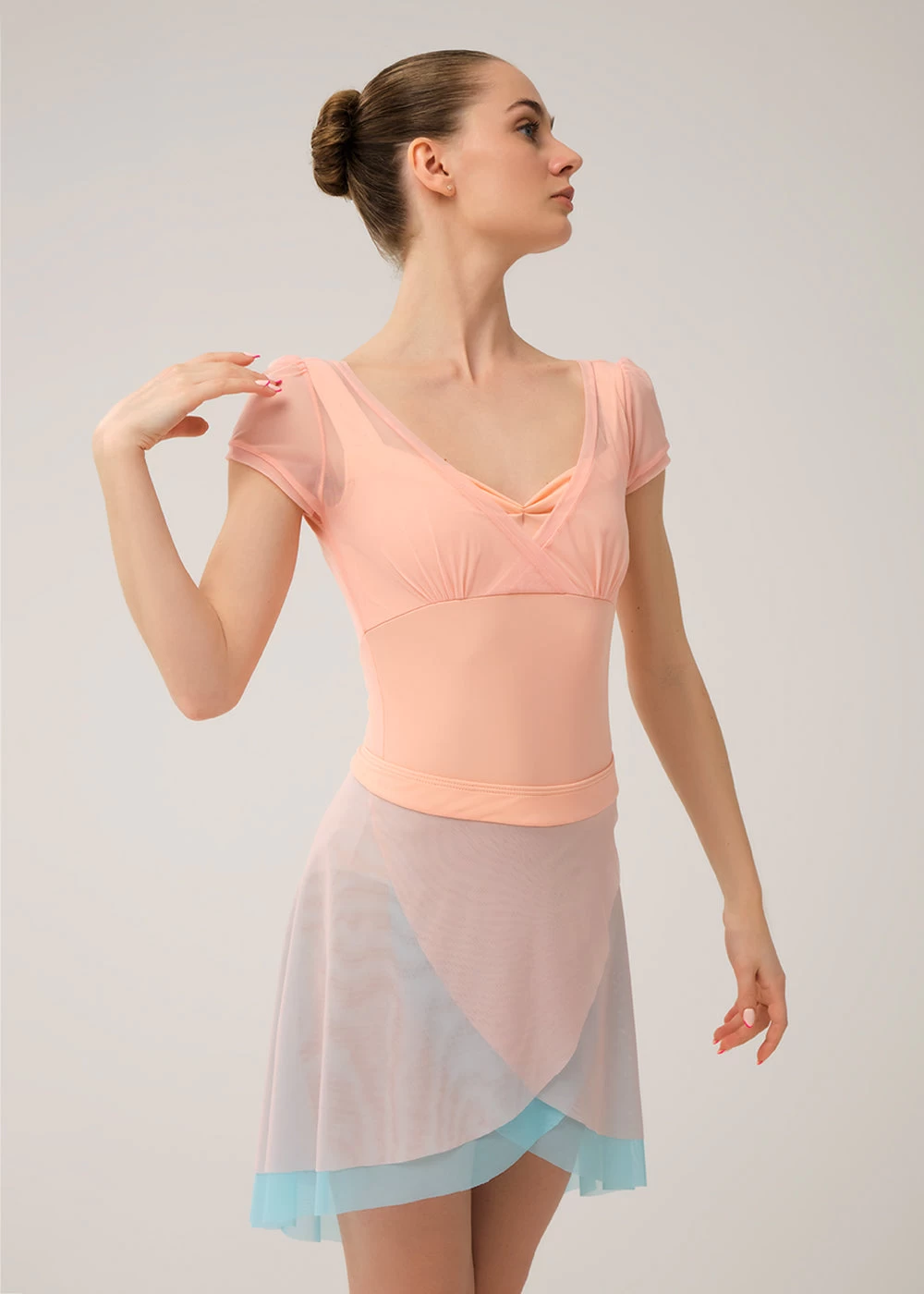Overlaying stretch tulle detail create an etherial look to this faux tank/cap sleeve leotard. Beautiful ballet leg cut and gorgeous open mid back with mesh overlay. This is a perfect leotard with added modesty. Fun new colors and tone on tone options. Fixed pinch on bust, bra cup pockets. Fully front lined.