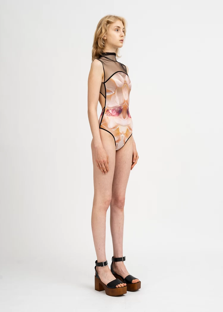 Mock neck leotard with black bridal mesh insert, featuring a continuous black outline pipe seam in coarse microfibre,