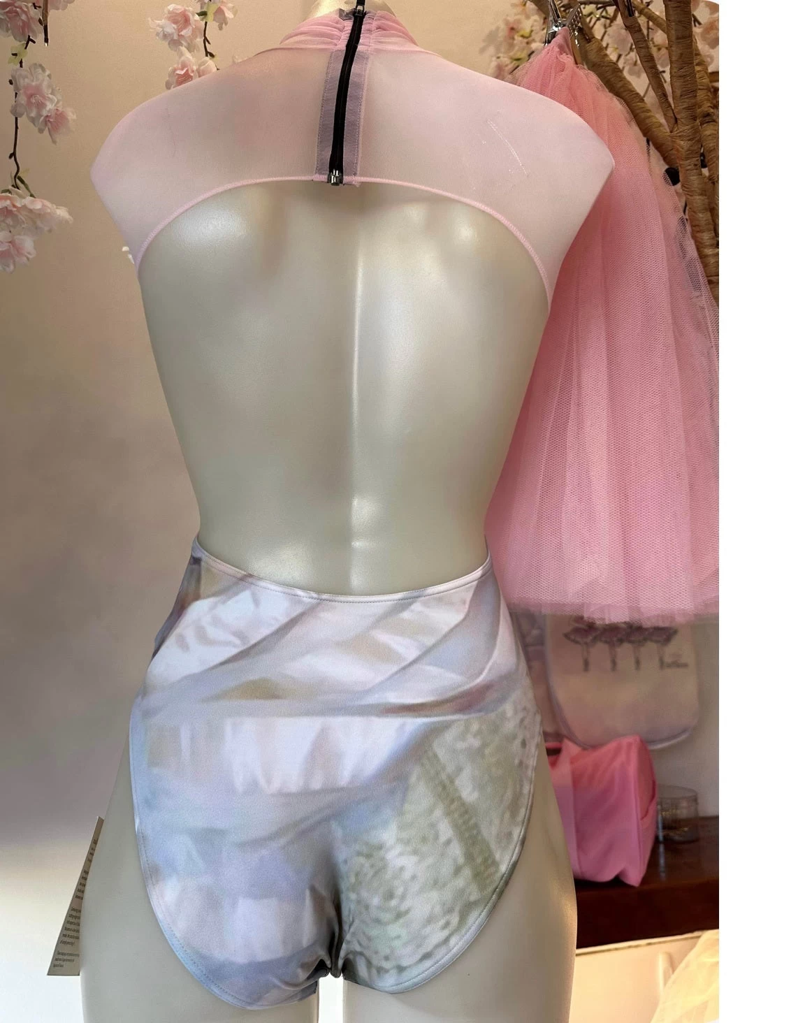 High tech Printed illusion leotard, fully covered in Italian pink mesh.