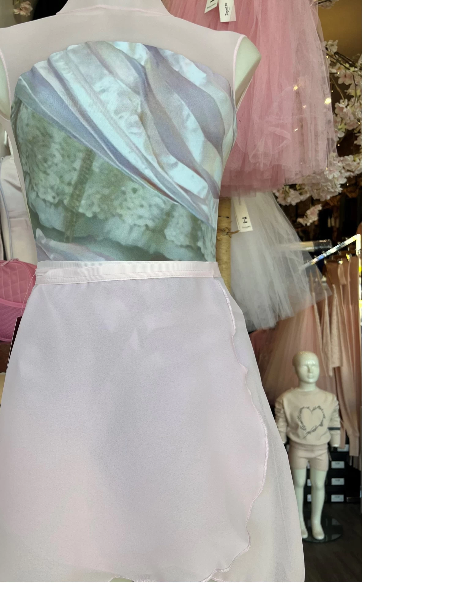 Mock neck leotard with pastel pink bridal mesh neck panel and built in lining.