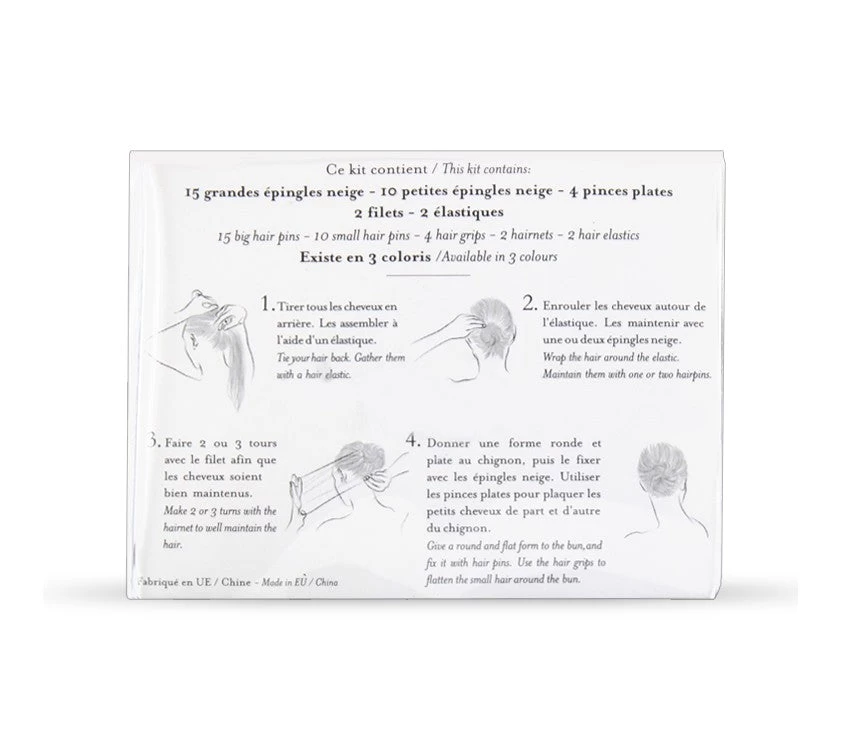 Brown hair kit for dance buns containing two bun nets, 15 snow clips of 6.8 cm, 10 snow clips of 5 cm, 4 flat clips of 5 cm and 2 hair bands. Repetto Paris plastic pouch packaging with explanatory note inside.