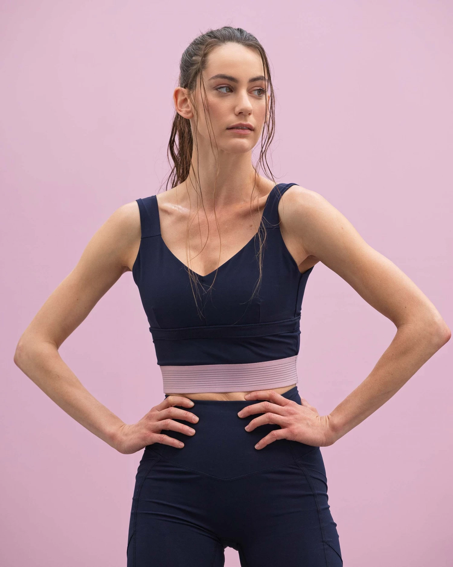 This high stretch technical mesh sports bra provides support and curves the body. Perfectly suited to sports activities, it combines practicality and femininity. Its V-cut reveals a very feminine neckline underlined by a wide elasticated band under the bust.