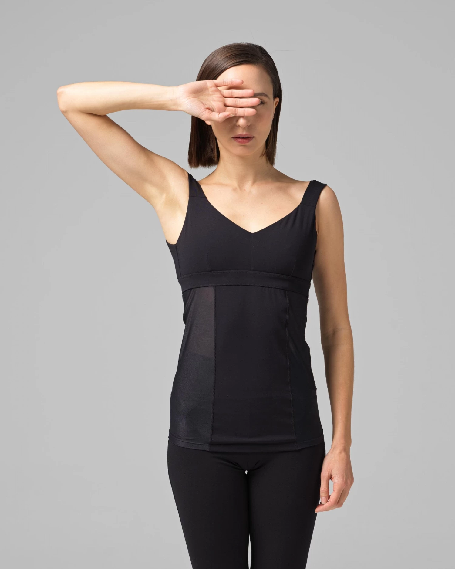This fitted top in breathable ultra-stretch material offers maximum comfort, a shaping effect and a feminine silhouette. Its cutouts on the sides in light mesh, fine mesh effect, subtly reveal the body.