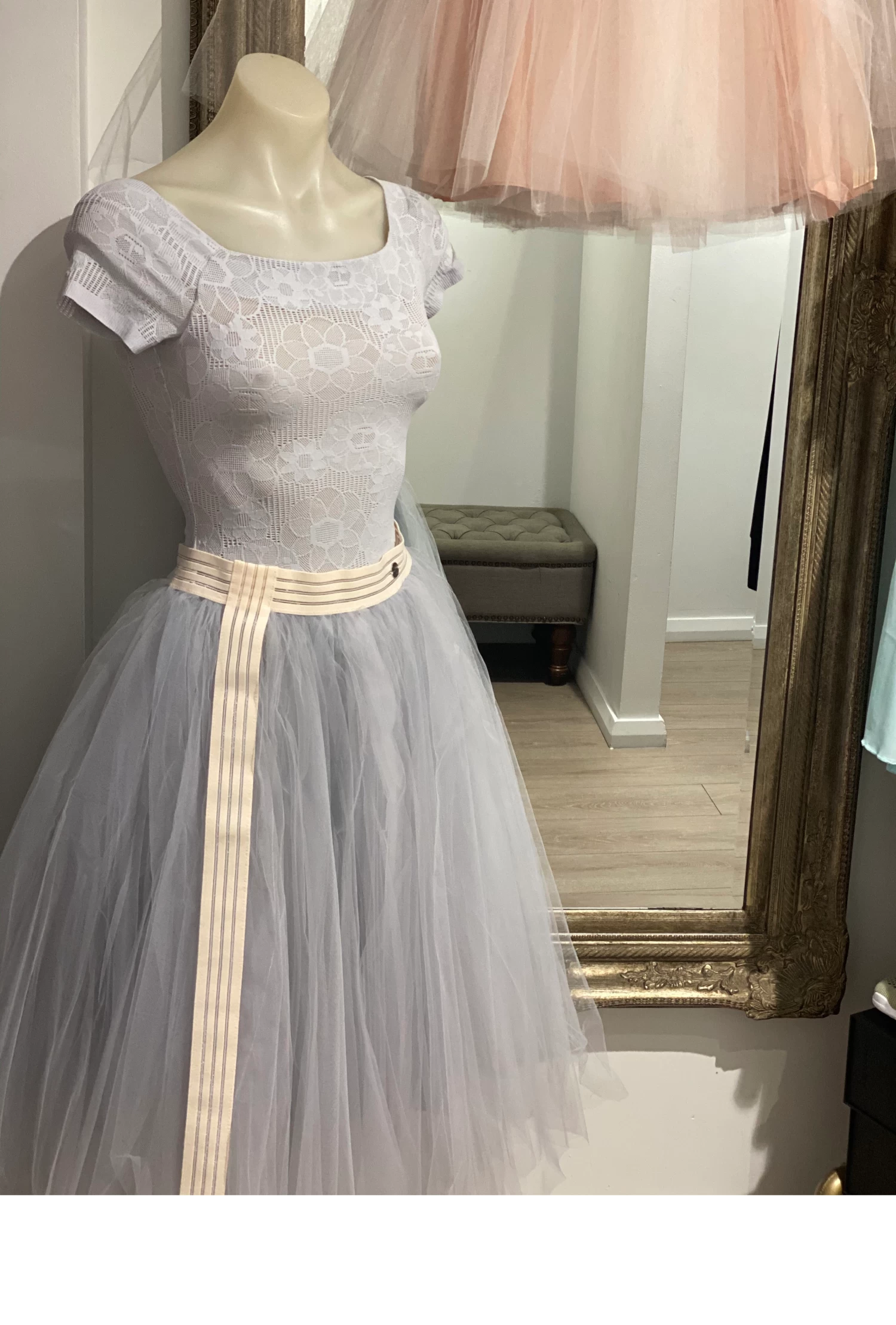 Color : Gray-Blue Details : Long petticoat. 2 overlapping layers of tulle. Refined elastic at the waist and on the left side. Inner lining. Metallic circle with logo R.