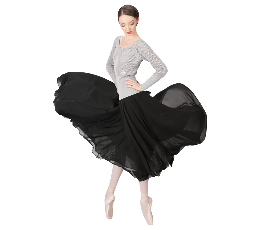 This rehearsal chiffon skirt is perfect for the studio and stage work. Plain on a side with a black basic colour, or Taupe Rose two-coloured reversible, to create the silhouette of its choice. Its tightening lace ties up in the waist allows to adjust it depending on the need. Transparent Repetto logo transfer on the front.