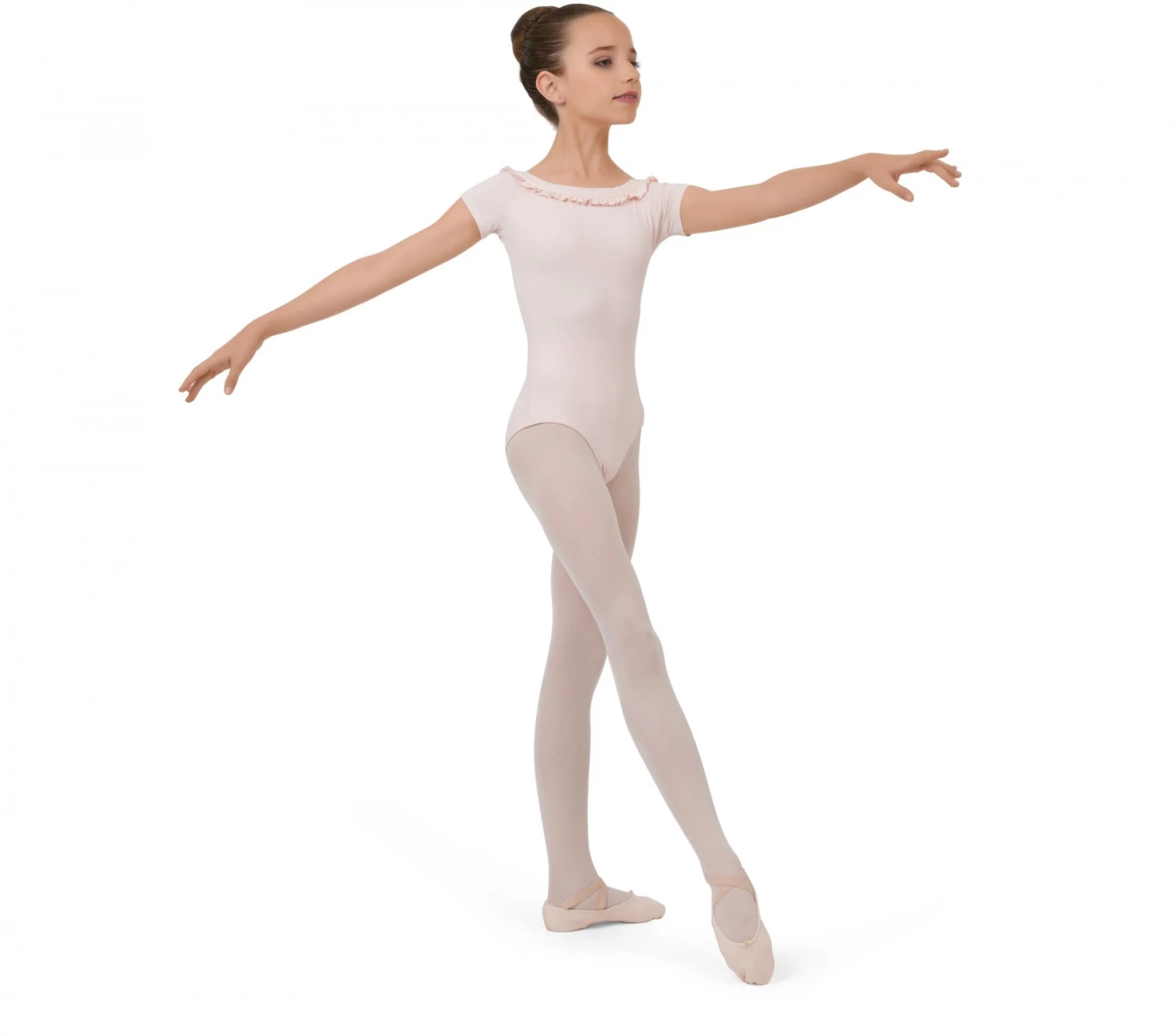 The short-sleeved leotard DE629 for young girls has a square neckline at the front for a good support, and a V-neckline at the back. The small flounce on the front and back neckline give fancy to the product.