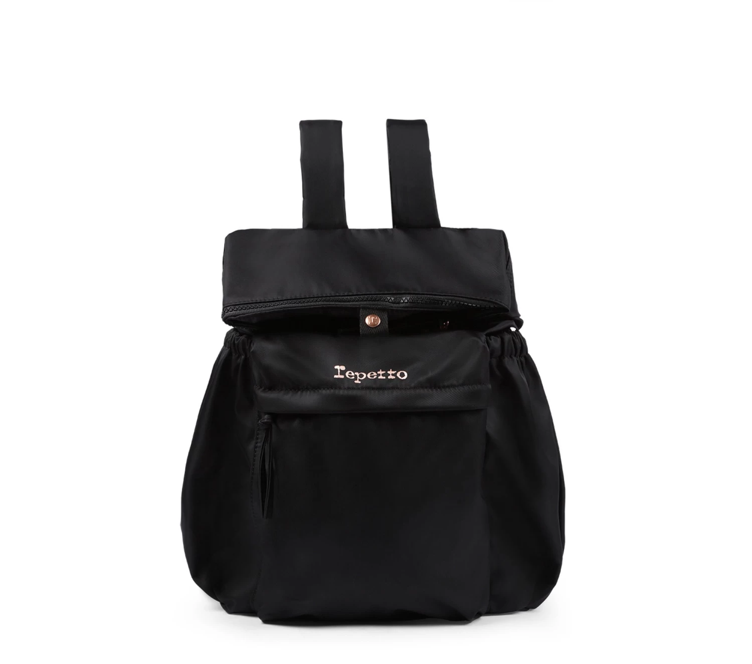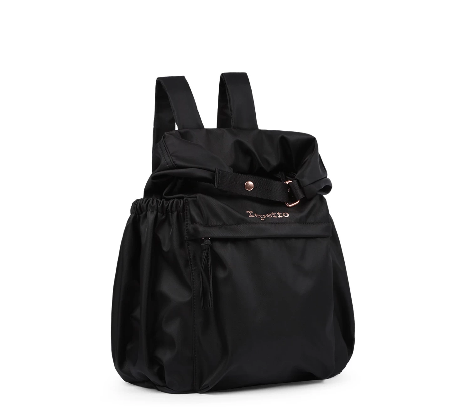 Details : zip closure. Adjustable straps. One zipped front pocket. Two exterior side pockets. Rose gold Repetto logo. Unlined.
