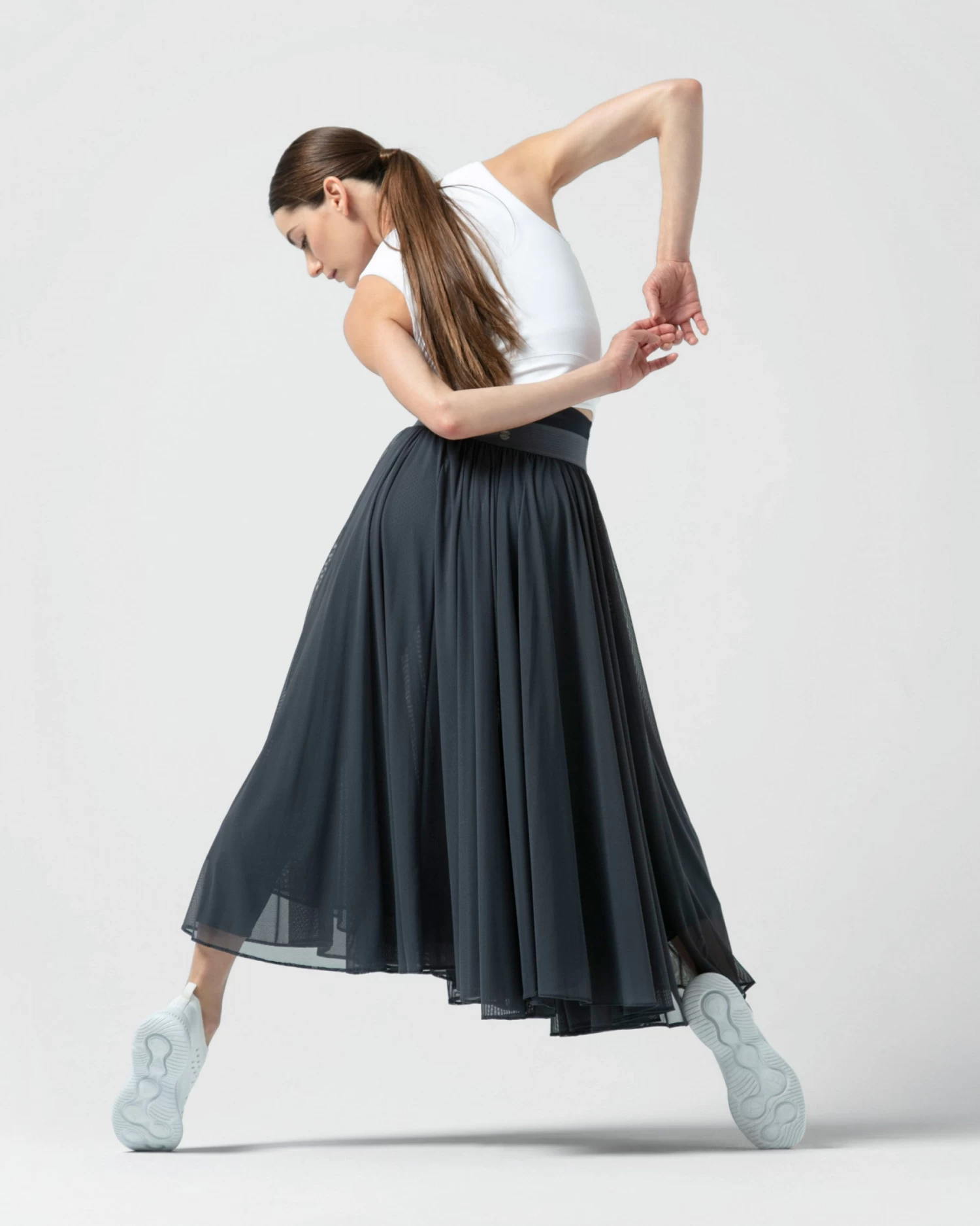 This skirt worked in a stretch mesh gives the silhouette a feminine and elegant look. The elasticated waist brings a sporty and modern touch to the outfit. Combine with our high-stretch leggings for a total look.