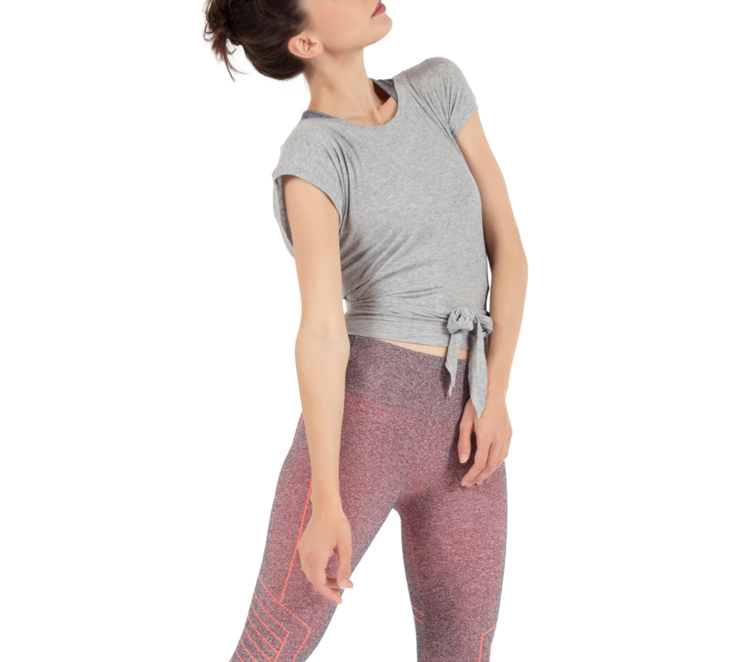 Details : rounded neckline on the front. Wrap-effect back. Ties on the front. Short sleeves. Metallic circle with logo R.