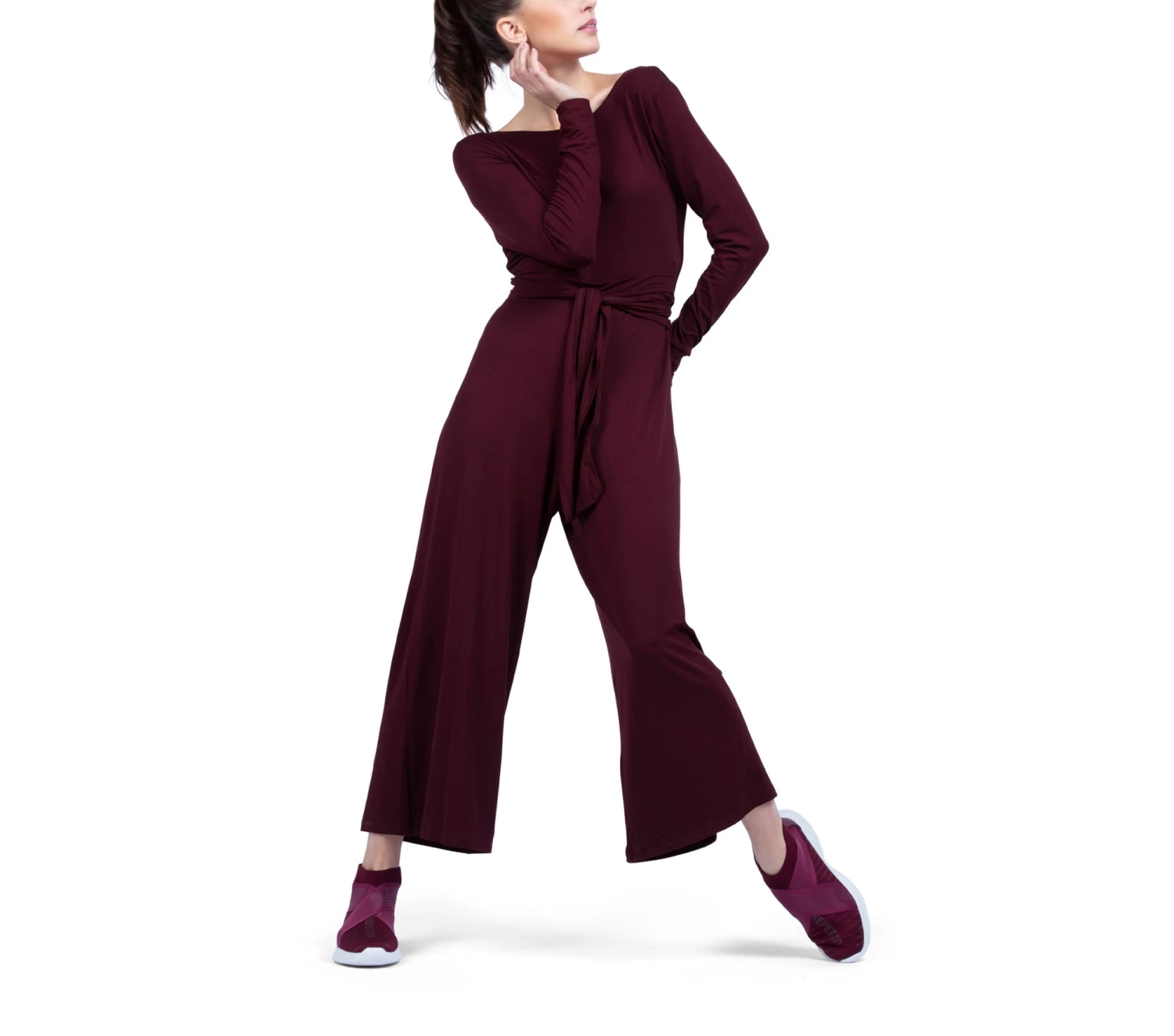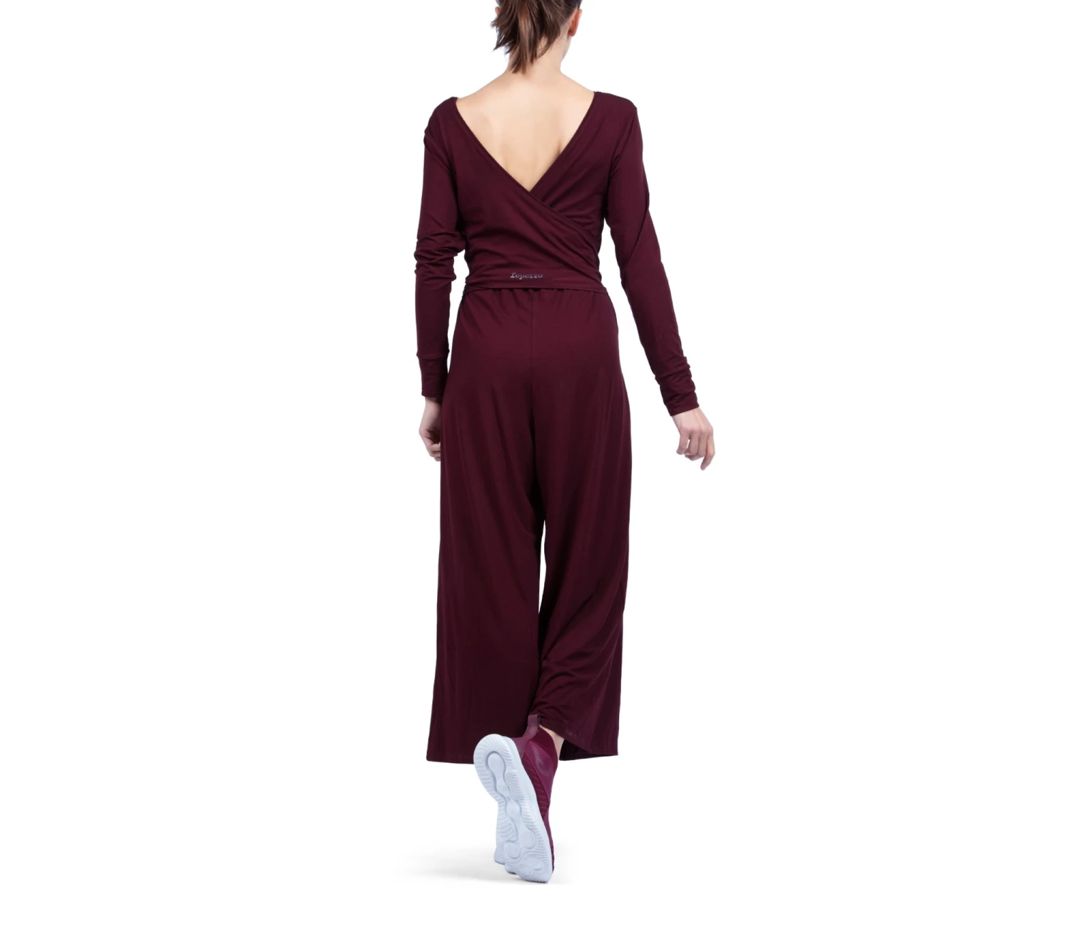 Details : loose jumpsuit. Long sleeves. Round neckline on the front. Wrap-effect back. Ties to tie on the front. 7/8 length. Silver transfer of the Repetto logo.