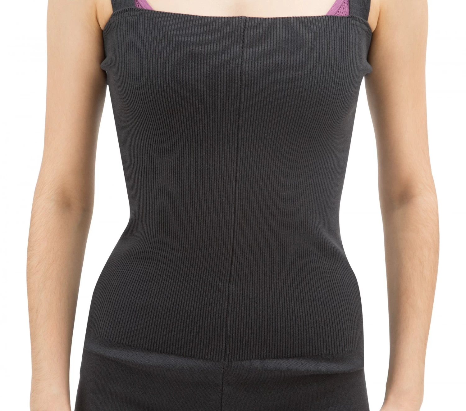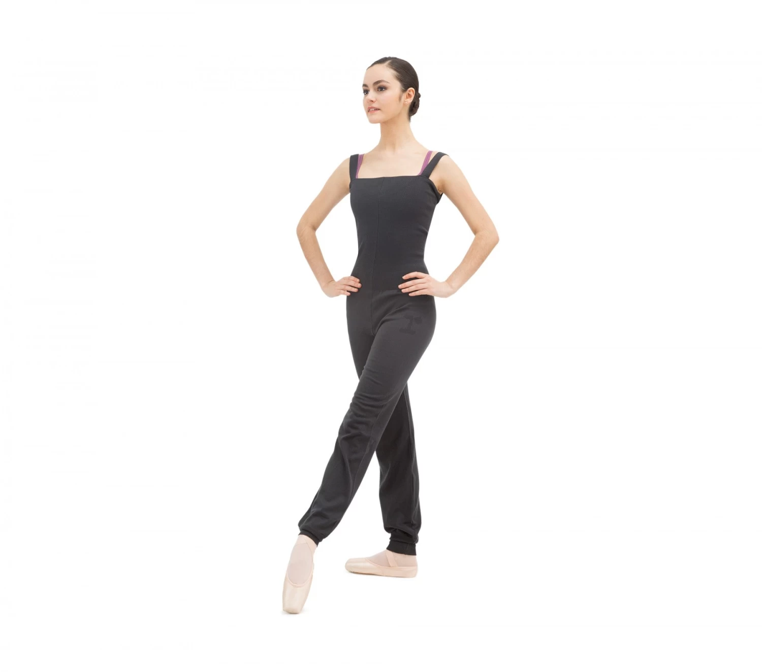 Anthracite gray jumpsuit wide straps. Bust and lower leg tightened by ribbing. Logo jacquard R tone on tone on the leg.